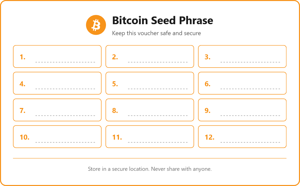 - Einrichtung einer neuen Wallet: Leere Voucher ausdrucken, bevor Sie eine neue Kryptowährungs‑Wallet erstellen, um Ihre Seed‑Phrase sofort aufzuschreiben