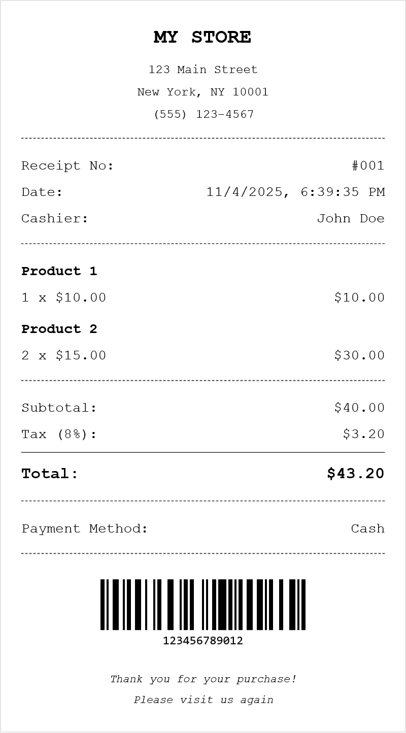 Generate professional receipts with barcode support. Create customizable store receipts with item details, pricing, tax calculations, and various barcode formats (CODE128, EAN-13, UPC, etc.).