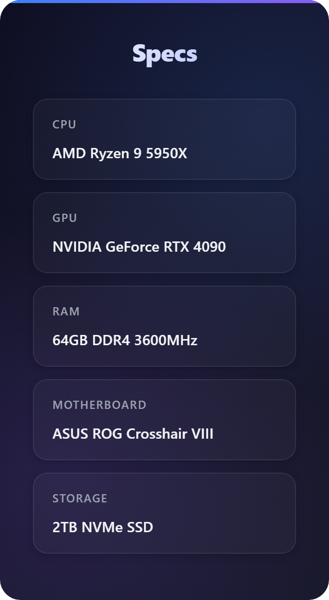 - PC Specs Panel: Pre-designed template for displaying gaming setup components including CPU, GPU, RAM, motherboard, storage, PSU, case, cooling, monitor, keyboard, mouse, and headset
