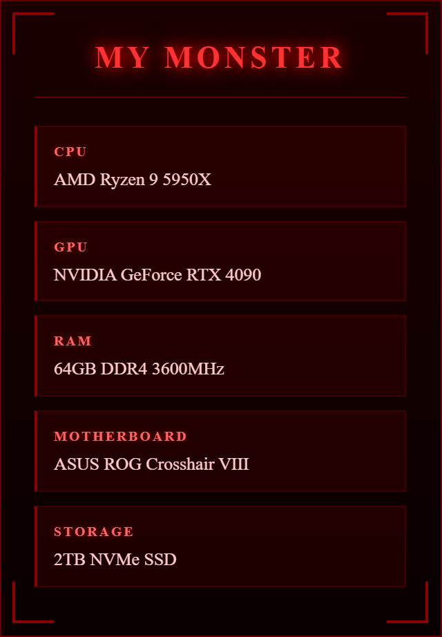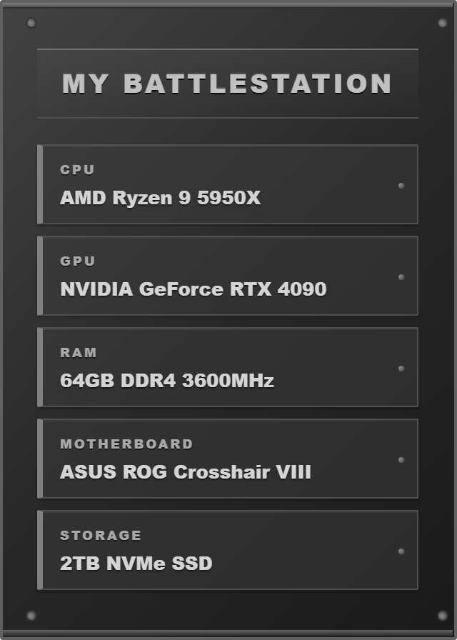 This Twitch panel creator allows you to design professional-looking custom Twitch panels without any design skills. The panel generator helps you create info panels for PC specifications or custom content using Markdown formatting. As a complete Twitch panel editor, you can choose from multiple visual themes and export your panels as high-quality images ready to upload to your Twitch channel.