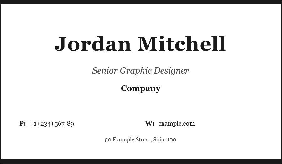 - Kohandatav teave: Lisage oma täisnimi, ametinimetus, ettevõte, e-posti aadress, telefon, veebisait ja aadress